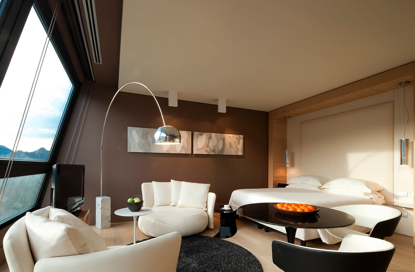 L’arredamento contemporaneo rispetta i caratteri della tradizione di montagna, con parquet in rovere naturale e mobilio di design rigorosamente italiano.