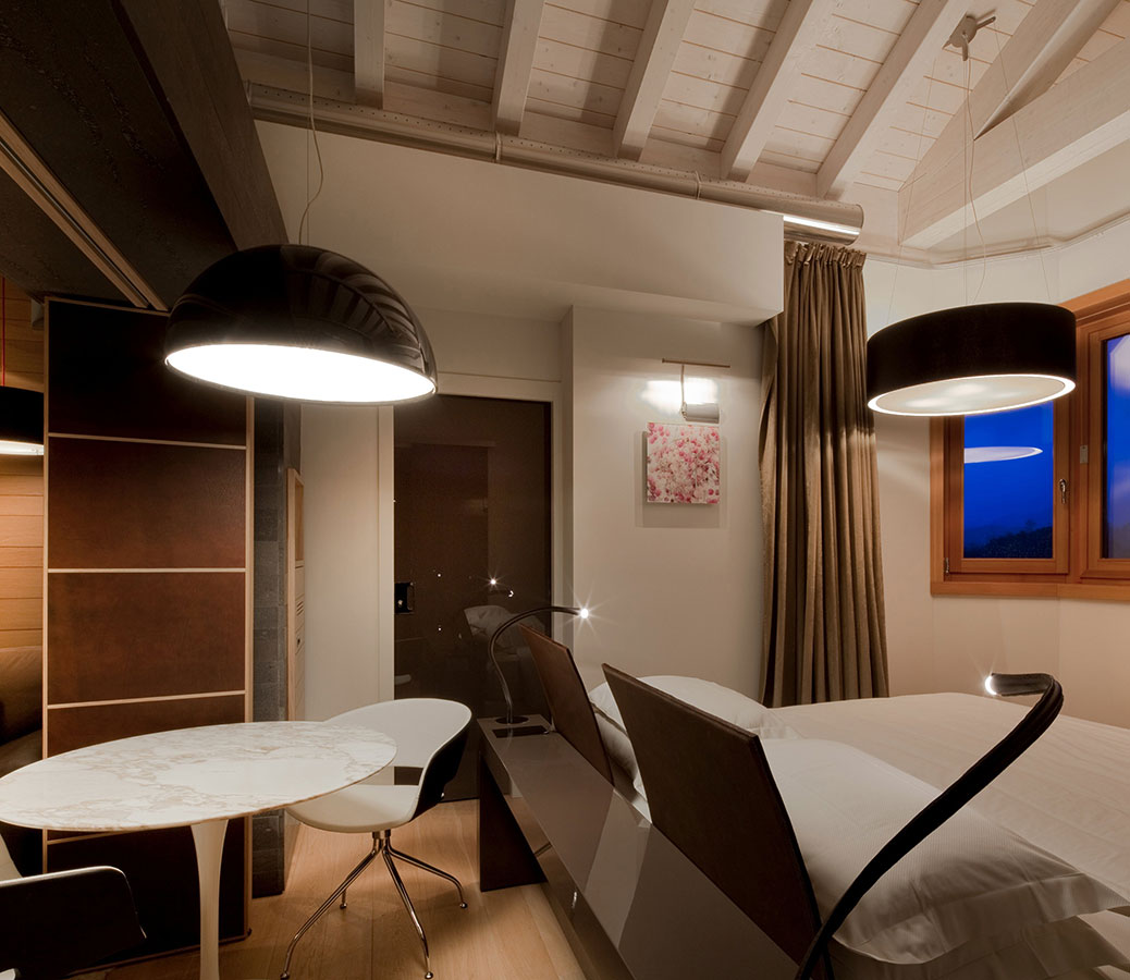 Un ambiente esclusivo e luminoso dove vivere un’esperienza di benessere totale. Il panorama montano ti accompagna in ogni momento, tra giochi di luce, vetrate e calore del legno. La SPA in suite completa questo piccolo angolo di paradiso affacciato sui monti.